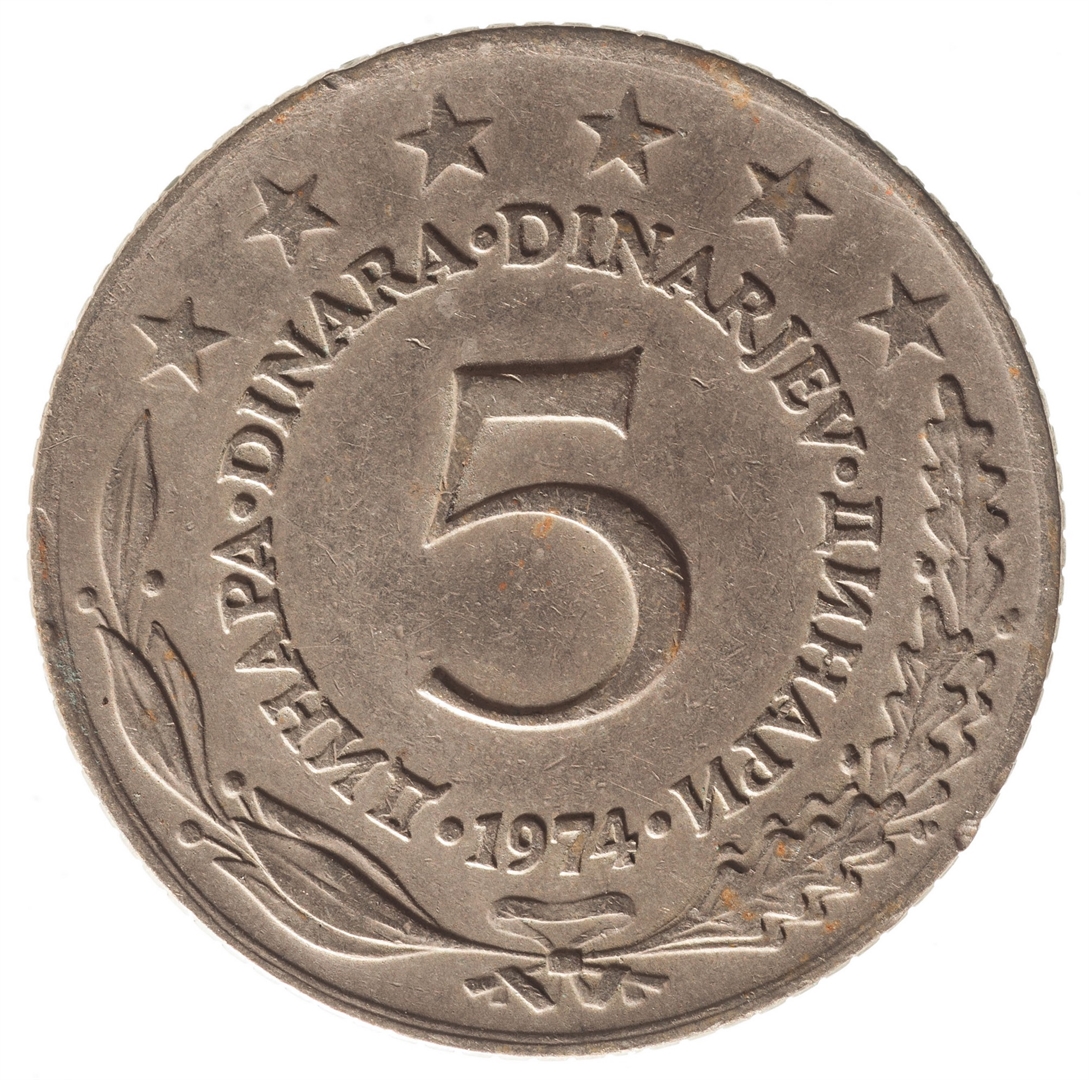 U sredini broj 5 (nominala), oko njega tekst DINAR na četiri jezika, a ispod toga godina 1974. Duž gornjeg ruba polukružno poredano 6 petokrakih zvjezdi.