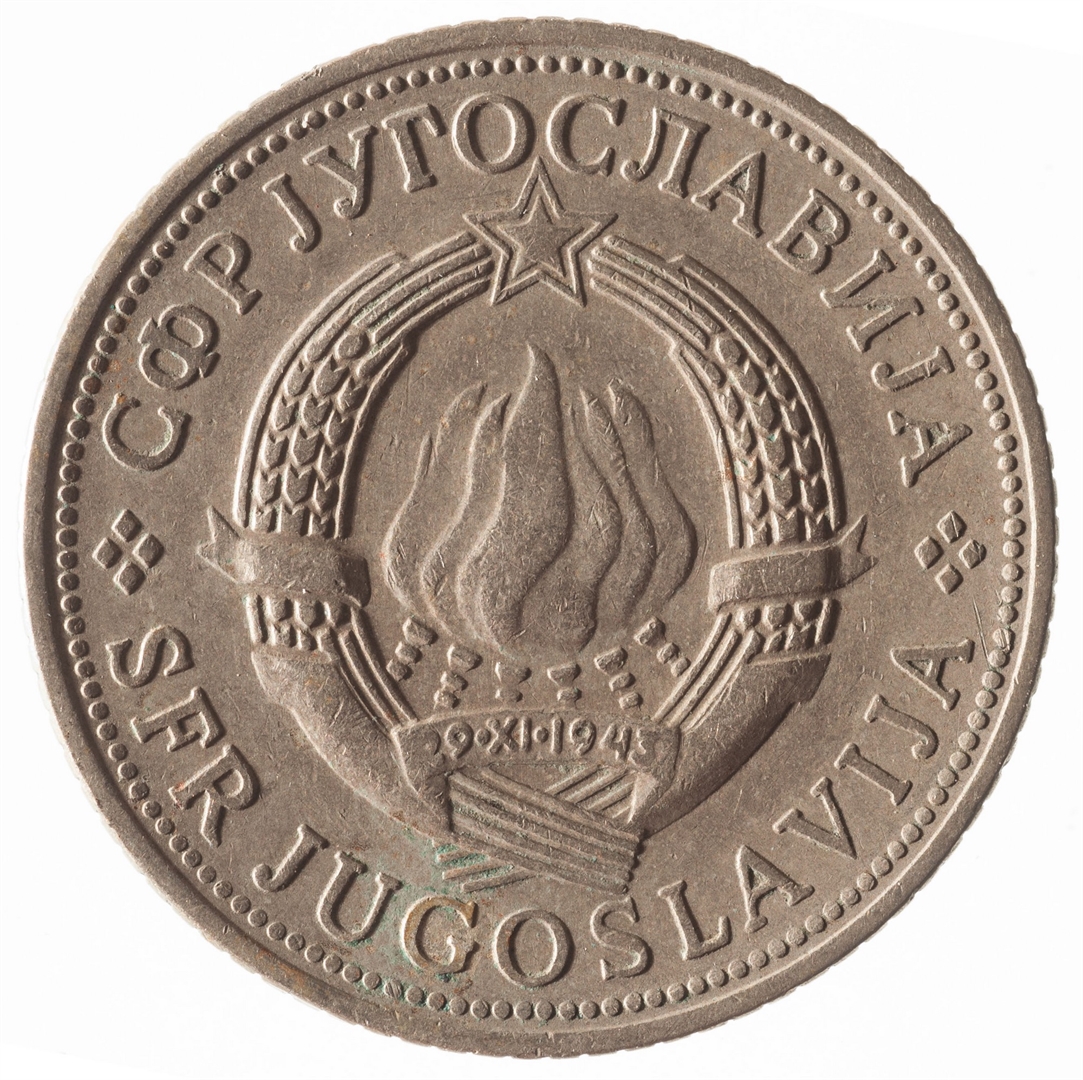 U sredini državni grb. U oko njega uz rub polukružno napisan tekst SFR JUGOSLAVIJA na latinici i ćirilici.