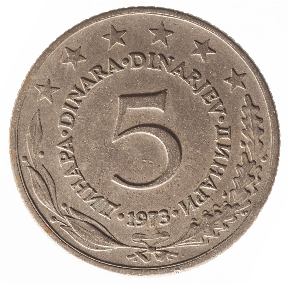 U sredini broj 5 (nominala), oko njega tekst DINAR na četiri jezika, a ispod toga godina 1973. Duž gornjeg ruba polukružno poredano 6 petokrakih zvjezdi.
