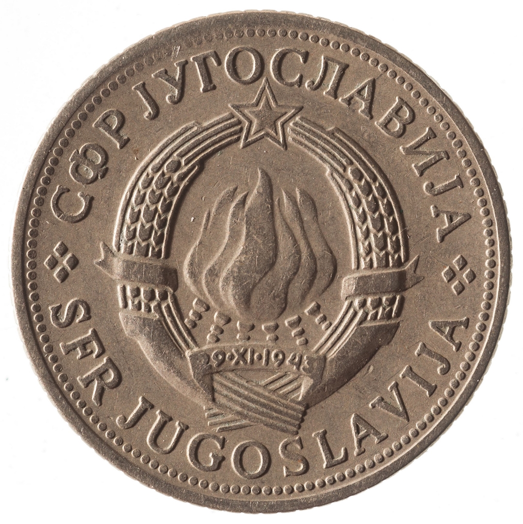 U sredini državni grb. U oko njega uz rub polukružno napisan tekst SFR JUGOSLAVIJA na latinici i ćirilici.