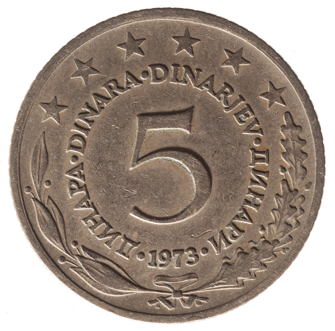 U sredini broj 5 (nominala), oko njega tekst DINAR na četiri jezika, a ispod toga godina 1973. Duž gornjeg ruba polukružno poredano 6 petokrakih zvjezdi.