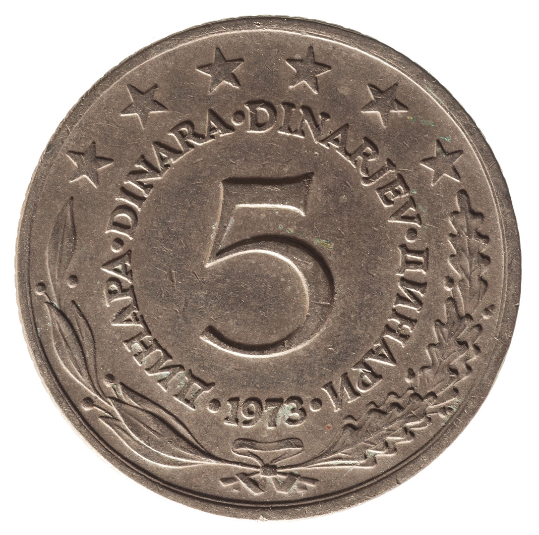 U sredini broj 5 (nominala), oko njega tekst DINAR na četiri jezika, a ispod toga godina 1973. Duž gornjeg ruba polukružno poredano 6 petokrakih zvjezdi.