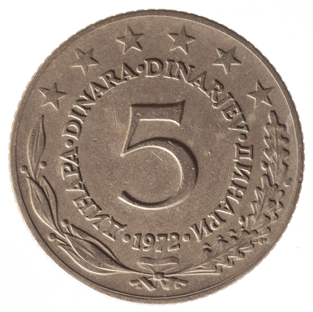 U sredini broj 5 (nominala), oko njega tekst DINAR na četiri jezika, a ispod toga godina 1972. Duž gornjeg ruba polukružno poredano 6 petokrakih zvjezdi.