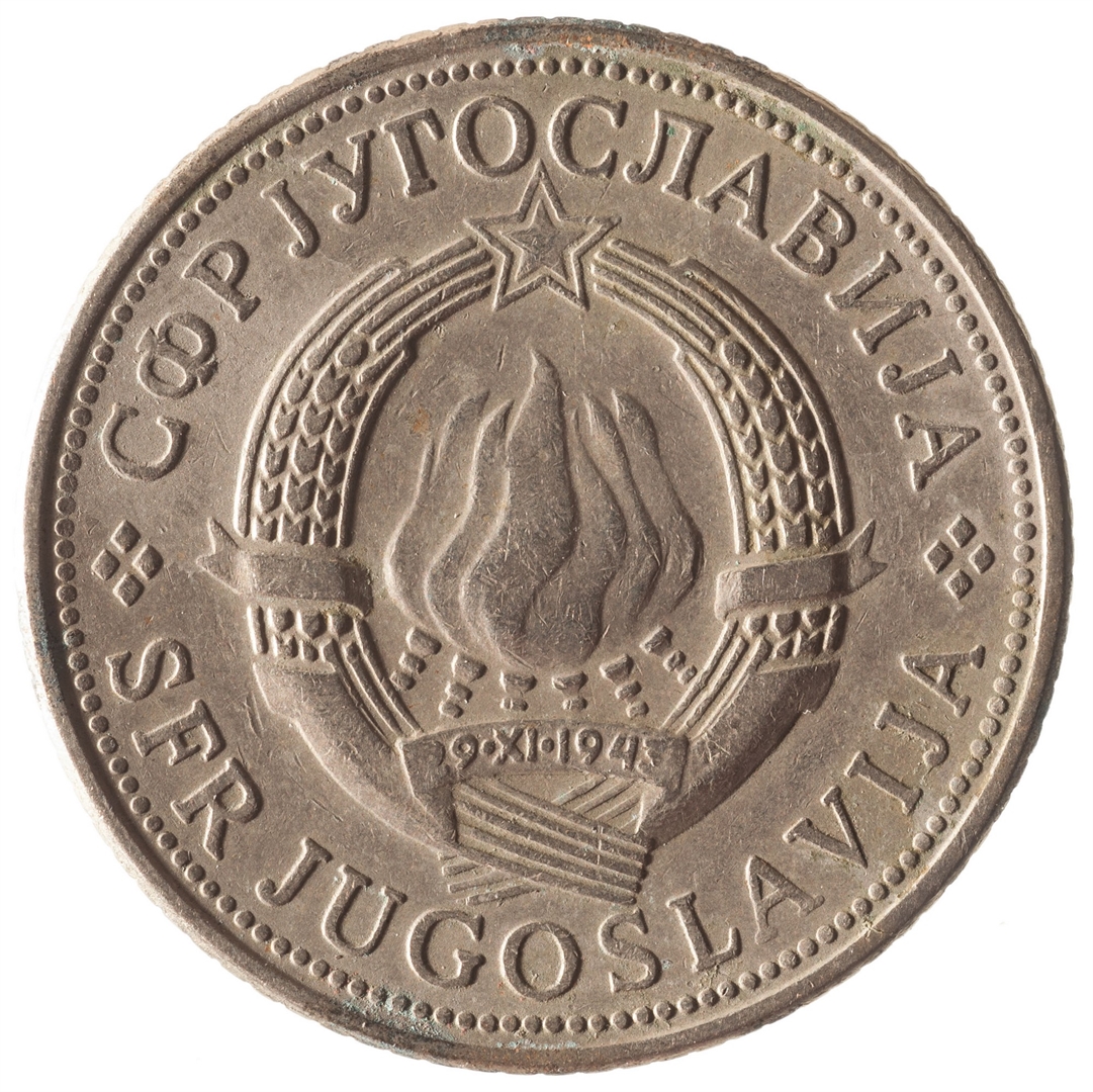 U sredini državni grb. U oko njega uz rub polukružno napisan tekst SFR JUGOSLAVIJA na latinici i ćirilici.