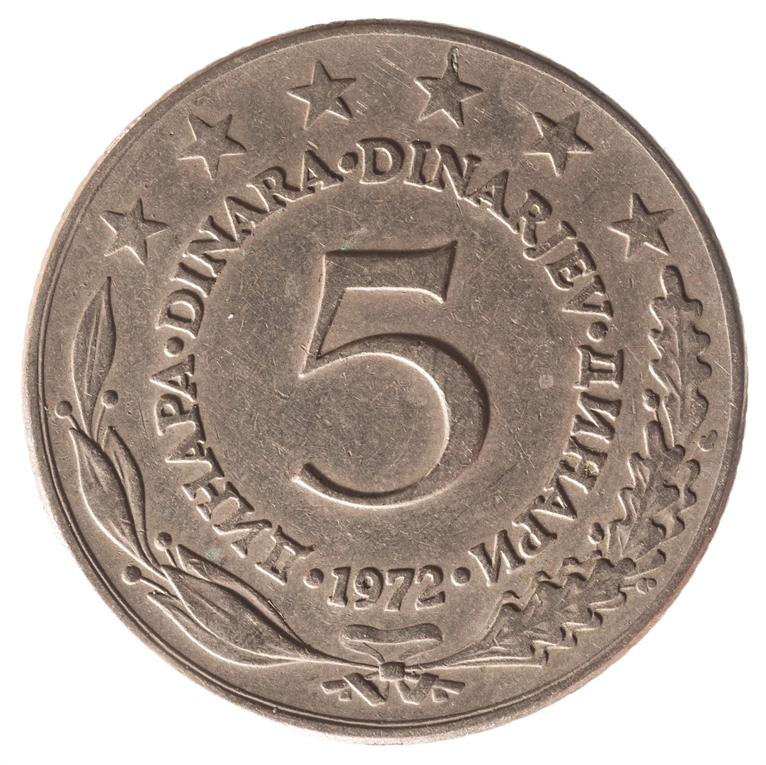 U sredini broj 5 (nominala), oko njega tekst DINAR na četiri jezika, a ispod toga godina 1972. Duž gornjeg ruba polukružno poredano 6 petokrakih zvjezdi.