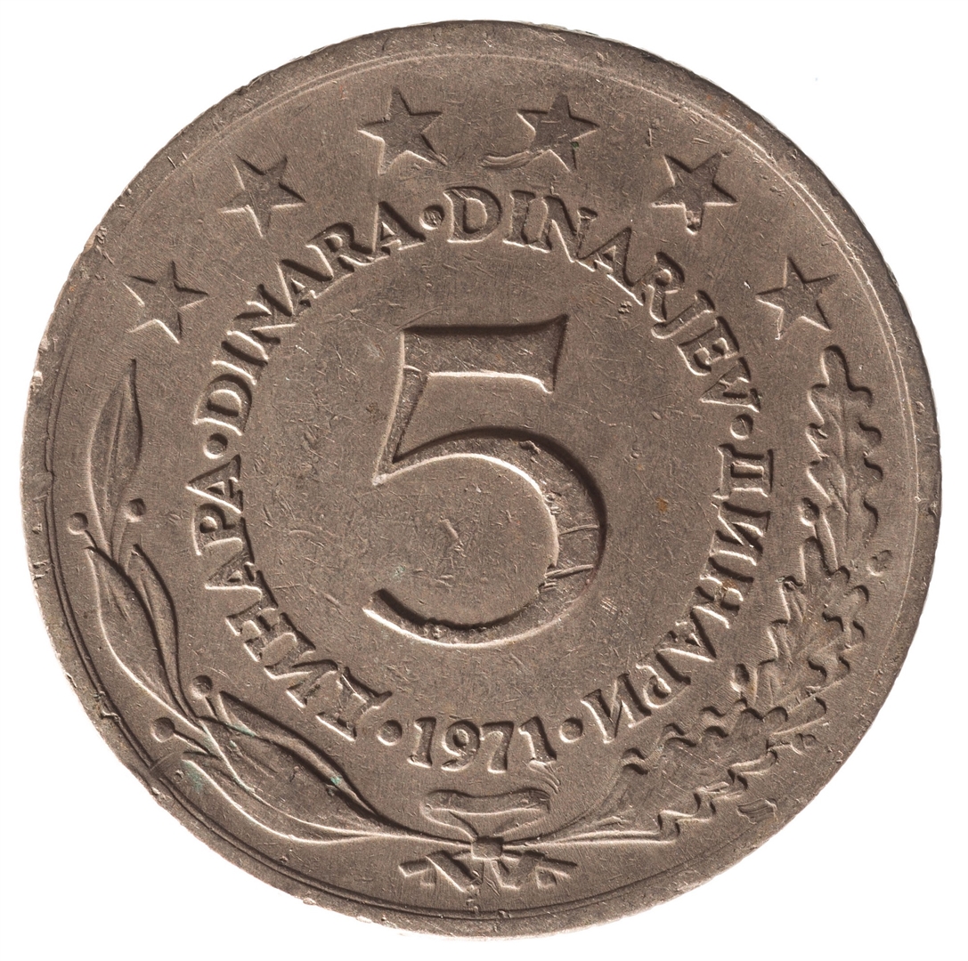 U sredini broj 5 (nominala), oko njega tekst DINAR na četiri jezika, a ispod toga godina 1971. Duž gornjeg ruba polukružno poredano 6 petokrakih zvjezdi.