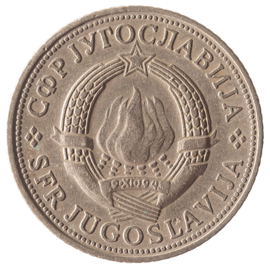 U sredini državni grb. U oko njega uz rub polukružno napisan tekst SFR JUGOSLAVIJA na latinici i ćirilici.