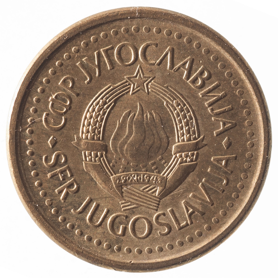 U sredini državni grb. U oko njega uz rub polukružno napisan tekst SFR JUGOSLAVIJA na latinici i ćirilici.
