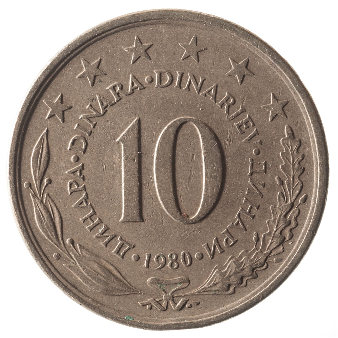 Avers: U sredini državni grb. U oko njega uz rub polukružno napisan tekst SFR JUGOSLAVIJA na latinici i ćirilici. Revers: U sredini broj 10 (nominala), oko njega tekst DINAR na četiri jezika, a ispod toga godina 1980. Duž gornjeg ruba polukružno poredano 6 petokrakih zvjezdi.