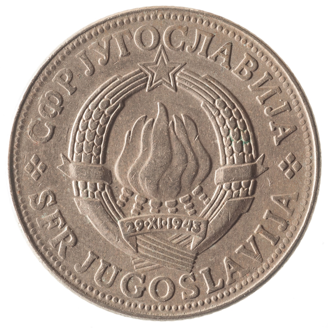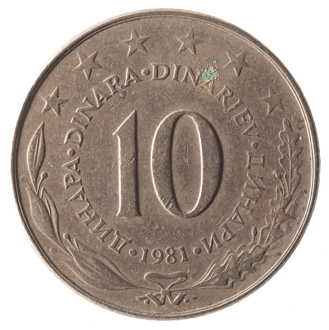 Avers: U sredini državni grb. U oko njega uz rub polukružno napisan tekst SFR JUGOSLAVIJA na latinici i ćirilici. Revers: U sredini broj 10 (nominala), oko njega tekst DINAR na četiri jezika, a ispod toga godina 1981. Duž gornjeg ruba polukružno poredano 6 petokrakih zvjezdi.