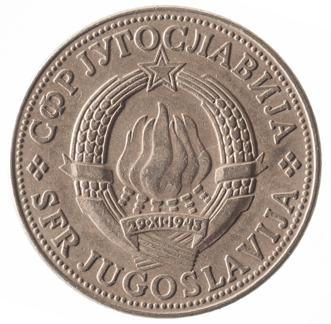 U sredini državni grb. U oko njega uz rub polukružno napisan tekst SFR JUGOSLAVIJA na latinici i ćirilici.