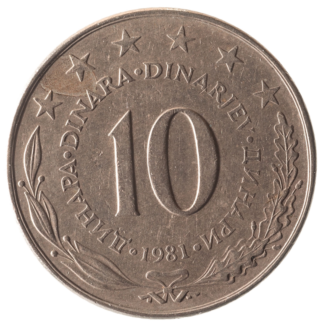 U sredini broj 10 (nominala), oko njega tekst DINAR na četiri jezika, a ispod toga godina 1981. Duž gornjeg ruba polukružno poredano 6 petokrakih zvjezdi.