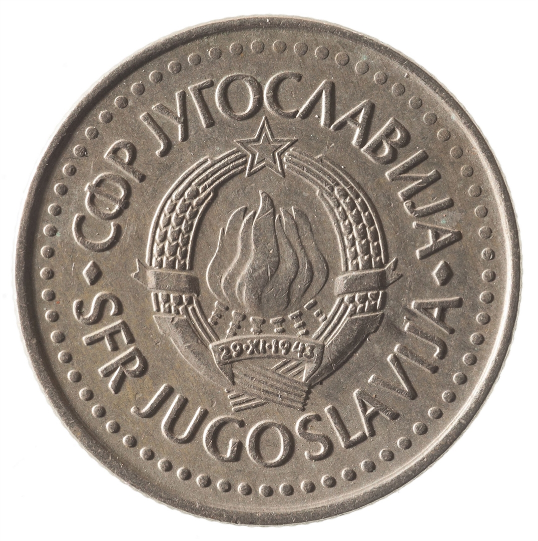 U sredini državni grb. Oko njega uz rub polukružno napisan tekst SFR JUGOSLAVIJA na latinici i ćirilici.