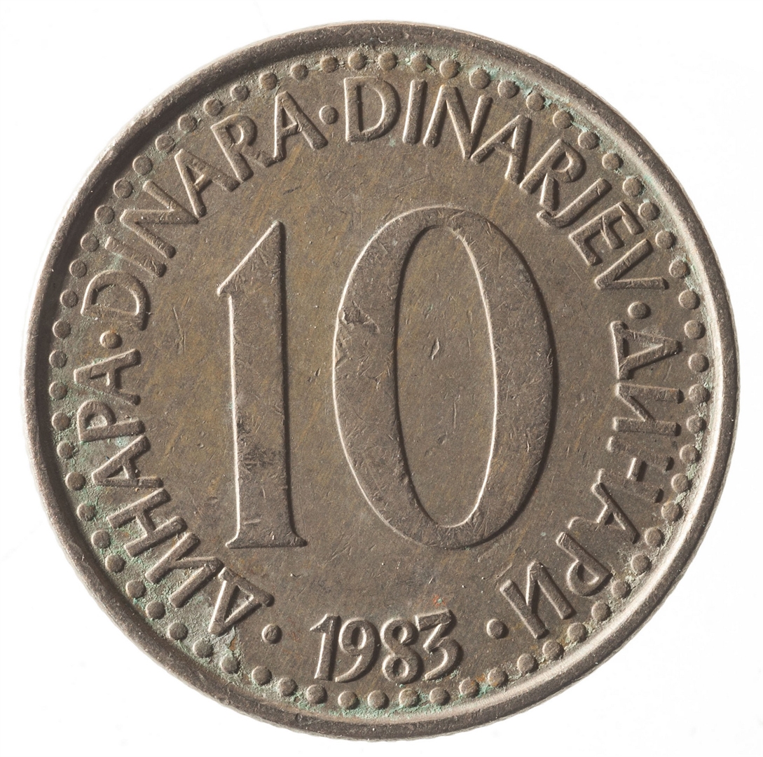 U sredini broj 10 (nominala), oko njega tekst DINAR na četiri jezika, a ispod toga godina 1983.