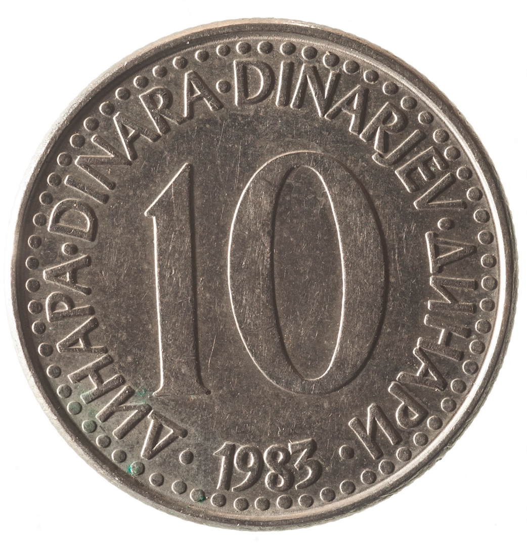 U sredini broj 10 (nominala), oko njega tekst DINAR na četiri jezika, a ispod toga godina 1983.