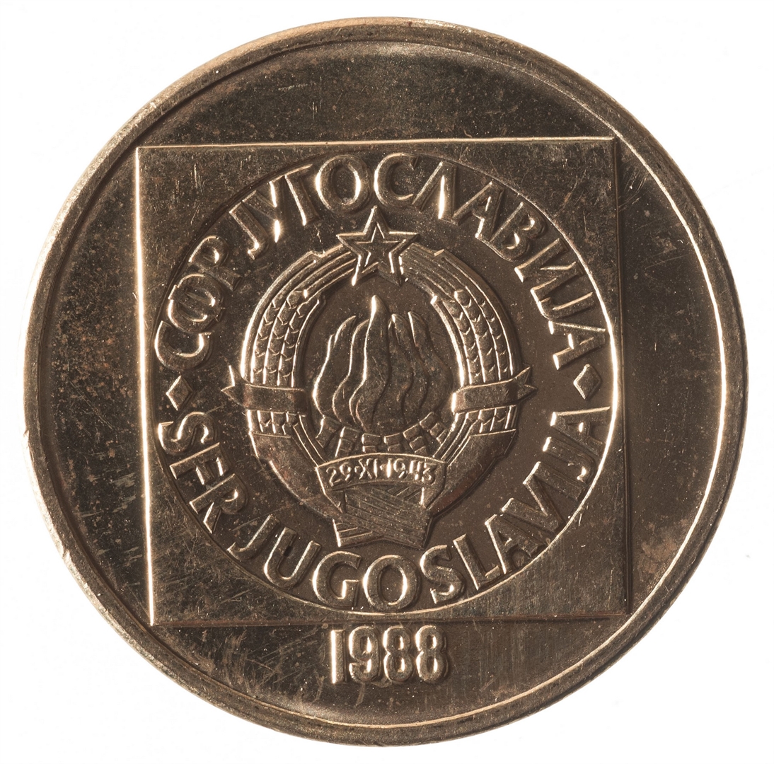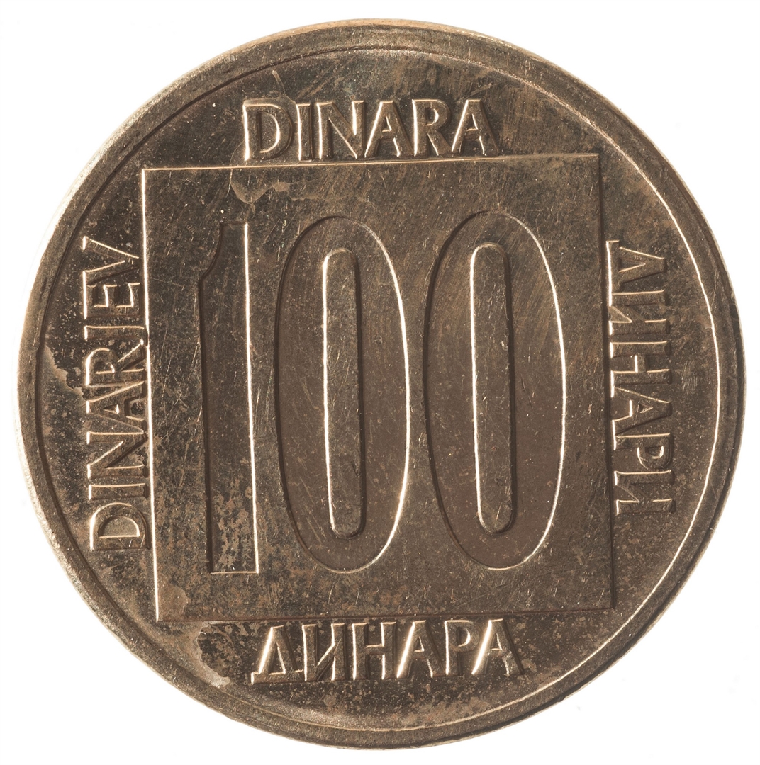 Avers: U sredini unutar četverokuta državni grb, a oko njega uz rub polukružno napisan tekst SFR JUGOSLAVIJA na latinici i ćirilici. Ispod godina 1988. Revers: U sredini četverokuta broj 100 (nominala), oko njega tekst DINAR na četiri jezika.