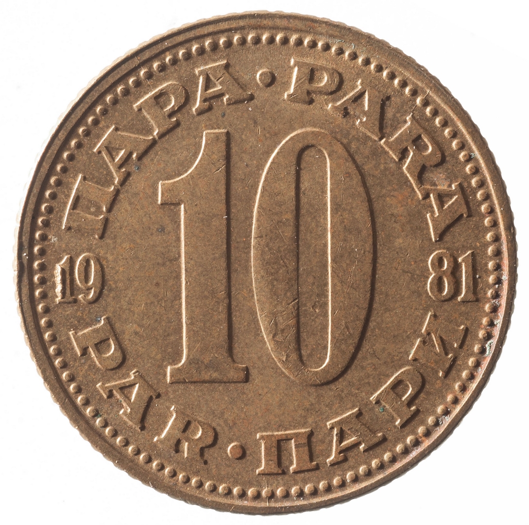 U sredini broj 10 (nominala), a oko njega tekst PARA na četiri jezika. U sredini uz lijevi i desni rub upisana godina 1981.