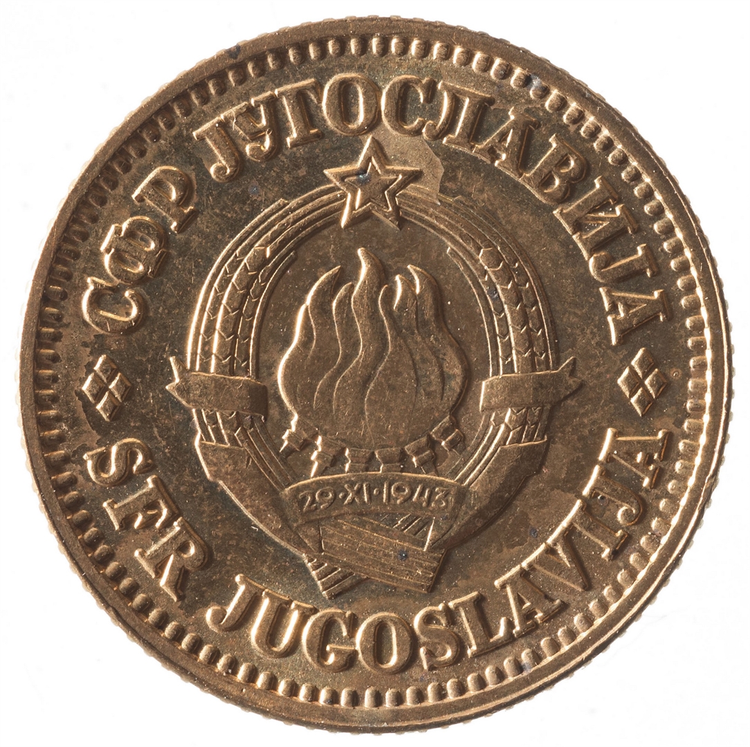 U sredini državni grb. U gornjem djelu uz rub polukružno napisan tekst SFR JUGOSLAVIJA na latinici i ćirilici.