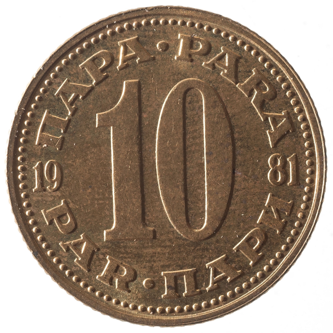 U sredini broj 10 (nominala), a oko njega tekst PARA na četiri jezika. U sredini uz lijevi i desni rub upisana godina 1981.