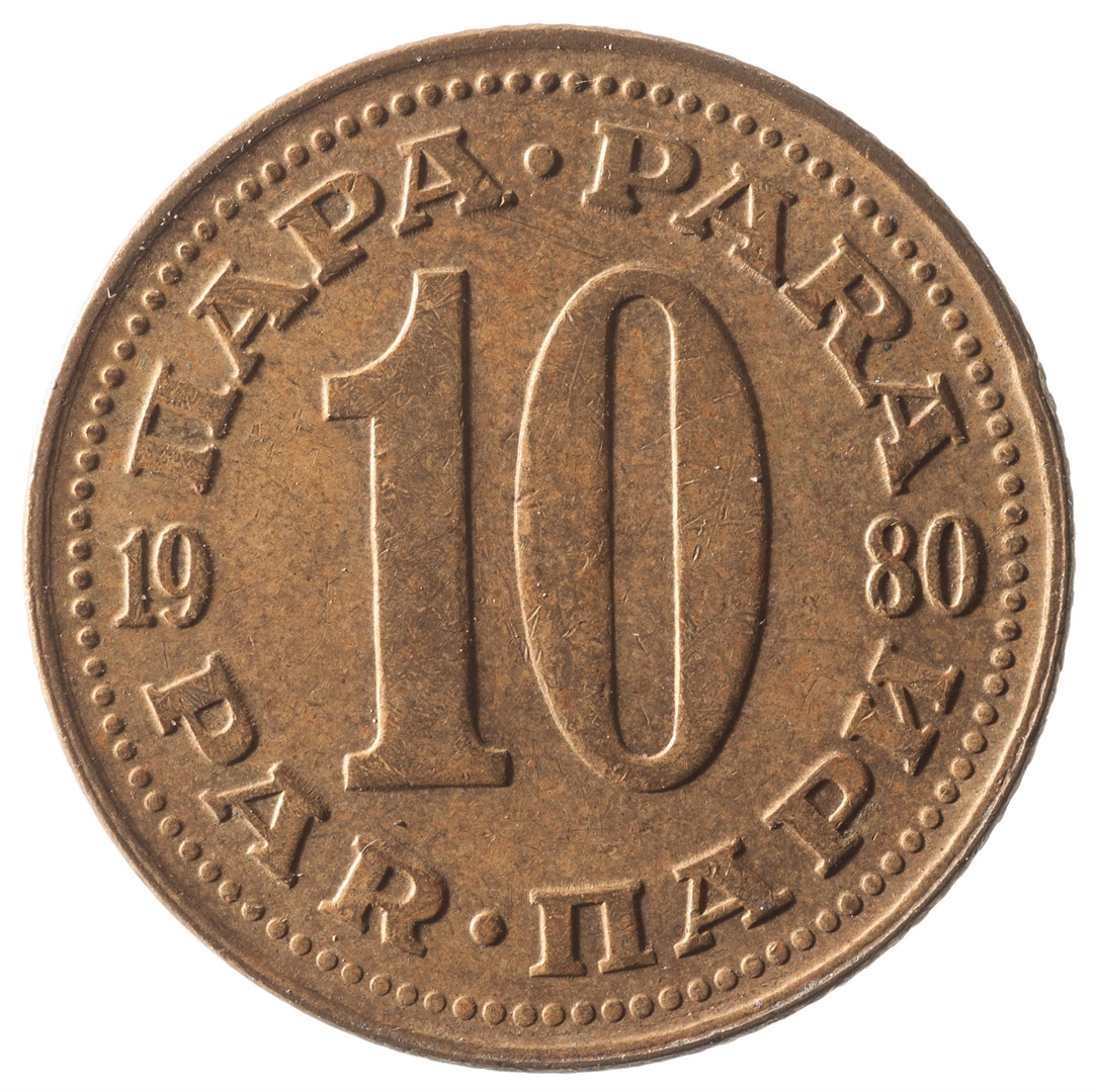 U sredini broj 10 (nominala), a oko njega tekst PARA na četiri jezika. U sredini uz lijevi i desni rub upisana godina 1980.