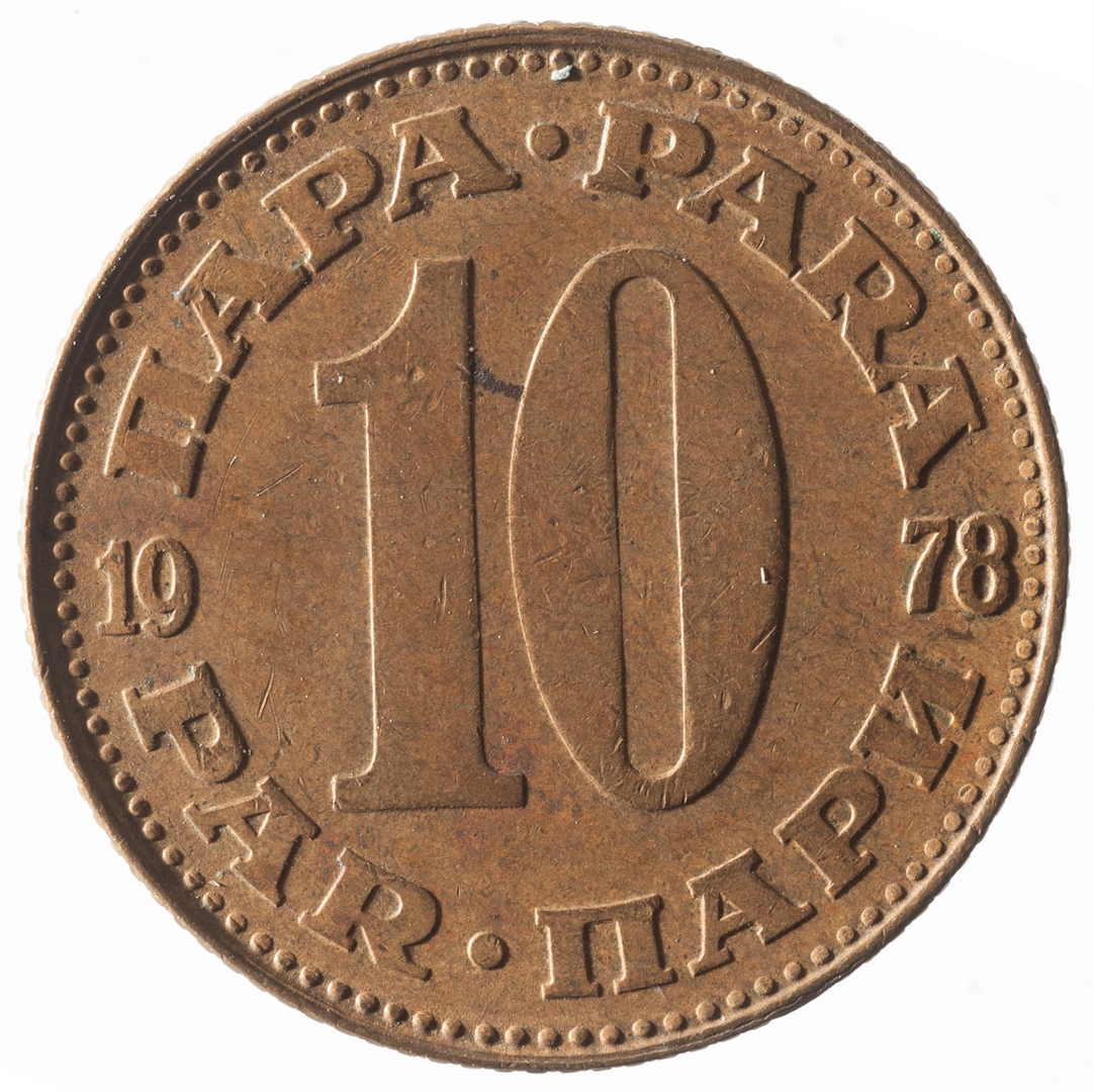 U sredini broj 10 (nominala), a oko njega tekst PARA na četiri jezika. U sredini uz lijevi i desni rub upisana godina 1978.