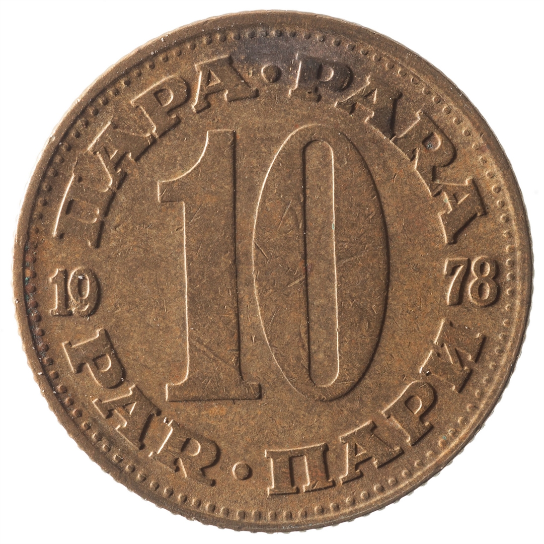 U sredini broj 10 (nominala), a oko njega tekst PARA na četiri jezika. U sredini uz lijevi i desni rub upisana godina 1978.