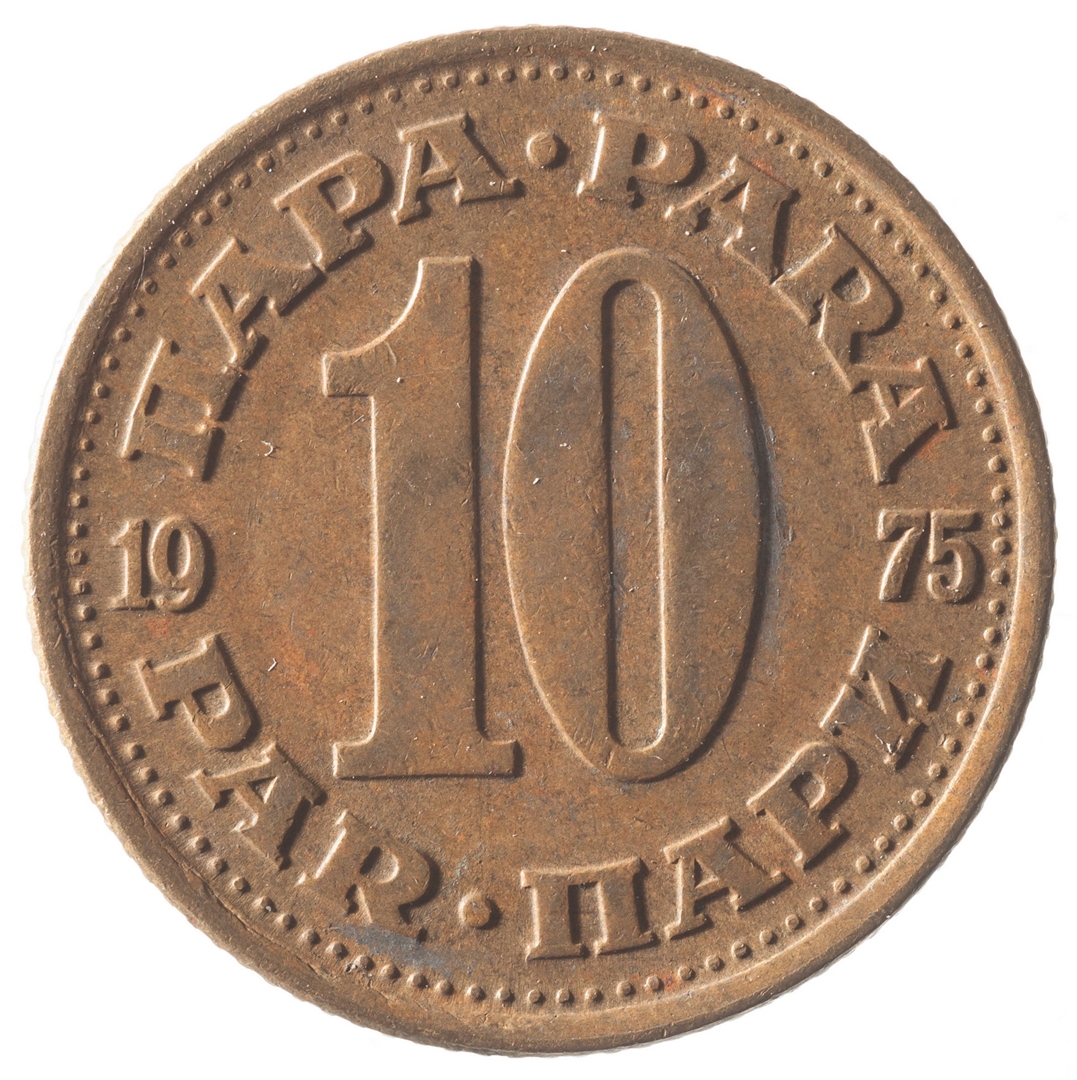 U sredini broj 10 (nominala), a oko njega tekst PARA na četiri jezika. U sredini uz lijevi i desni rub upisana godina 1975.