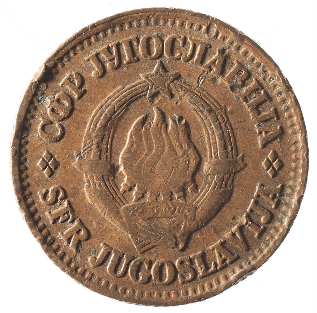 U sredini državni grb. U gornjem djelu uz rub polukružno napisan tekst SFR JUGOSLAVIJA na latinici i ćirilici.