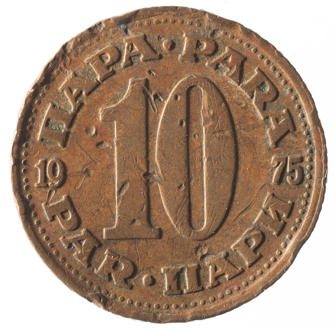 U sredini broj 10 (nominala), a oko njega tekst PARA na četiri jezika. U sredini uz lijevi i desni rub upisana godina 1975.