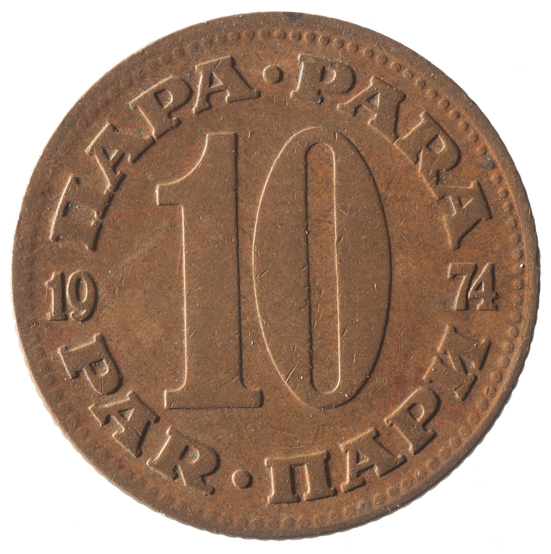 U sredini broj 10 (nominala), a oko njega tekst PARA na četiri jezika. U sredini uz lijevi i desni rub upisana godina 1974.