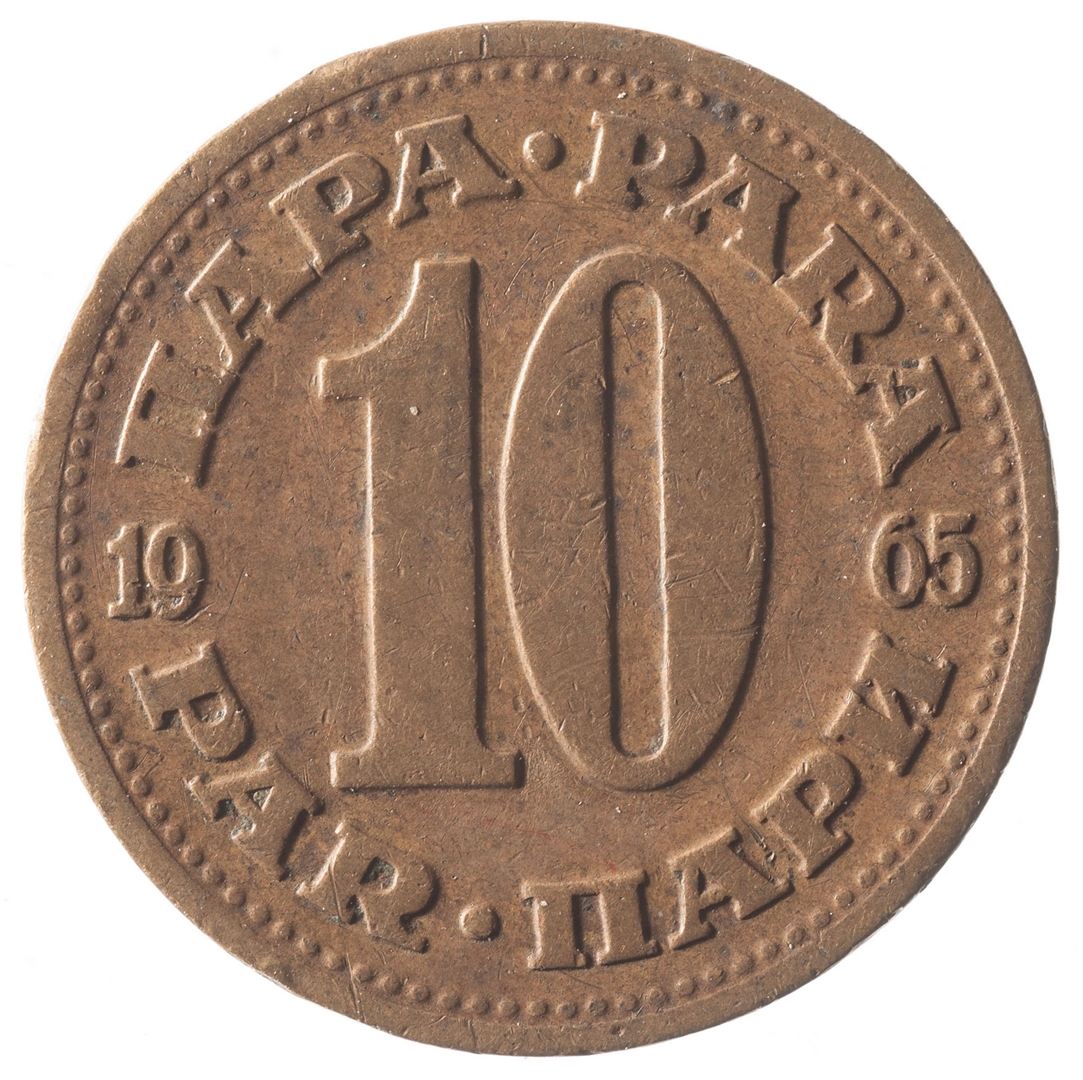 U sredini broj 10 (nominala), a oko njega tekst PARA na četiri jezika. U sredini uz lijevi i desni rub upisana godina 1965.