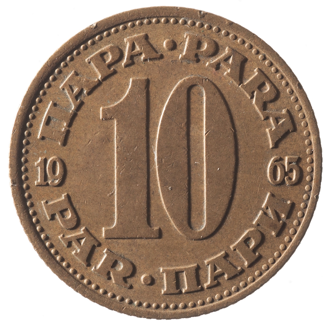 U sredini broj 10 (nominala), a oko njega tekst PARA na četiri jezika. U sredini uz lijevi i desni rub upisana godina 1965.