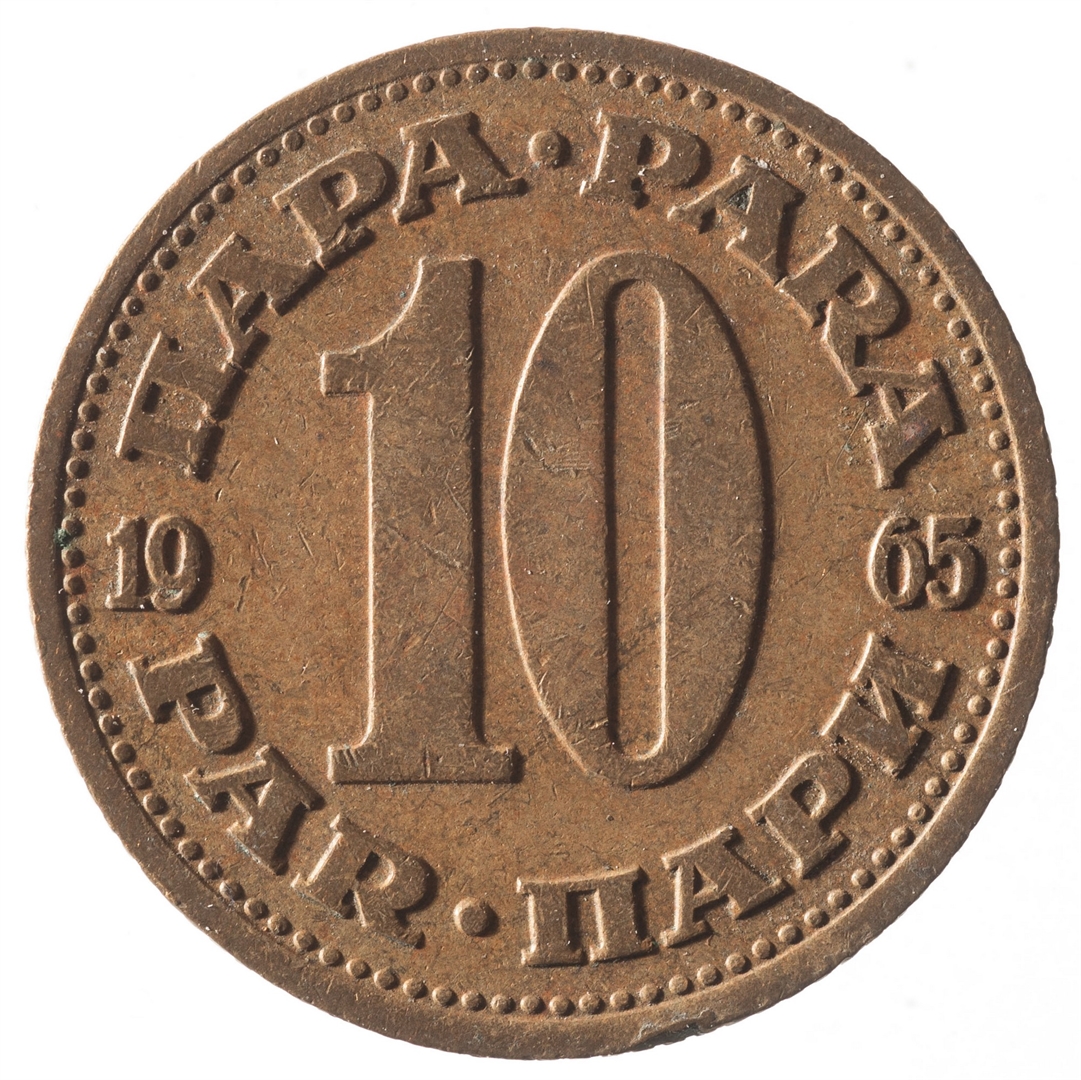 U sredini broj 10 (nominala), a oko njega tekst PARA na četiri jezika. U sredini uz lijevi i desni rub upisana godina 1965.