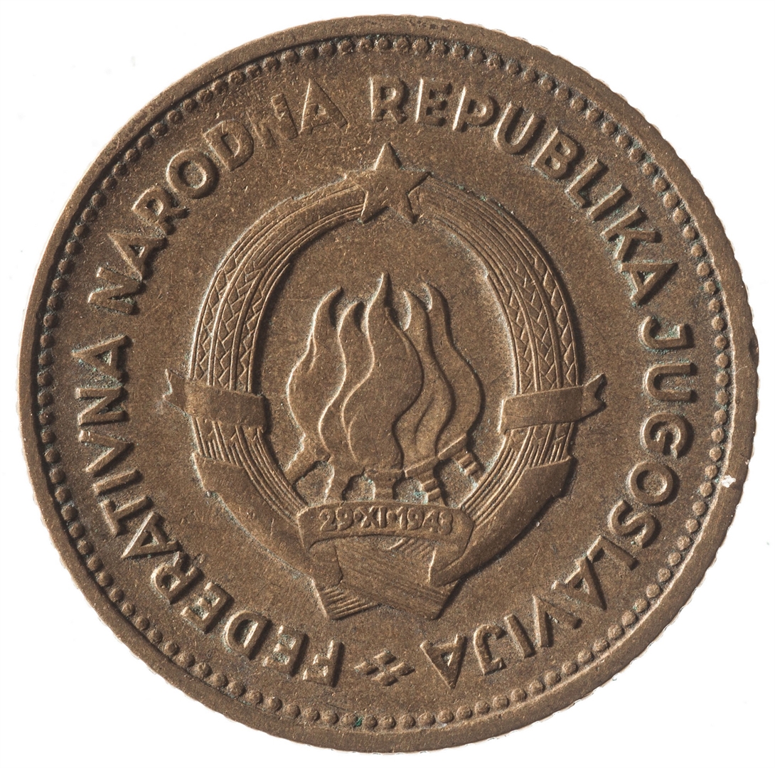 U sredini državni grb. U gornjem djelu uz rub polukružno napisan tekst FEDERATIVNA NARODNA REPUBLIKA JUGOSLAVIJA.