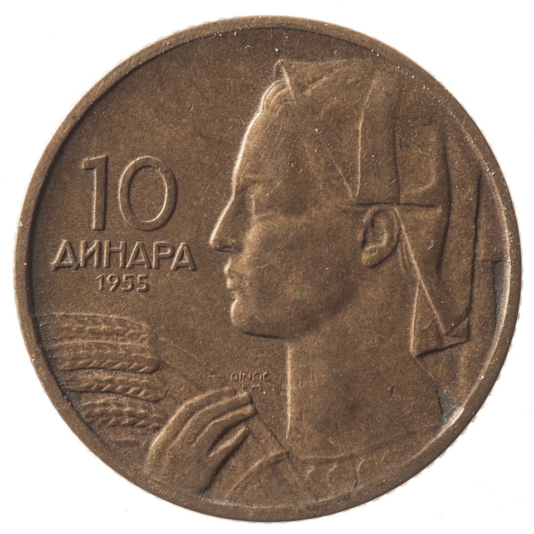 Prikaz seljanke koja drži žito u profilu.Uz rub broj 10 (nominala), a ispod njega tekst DINARA na ćirilici i godina 1955.