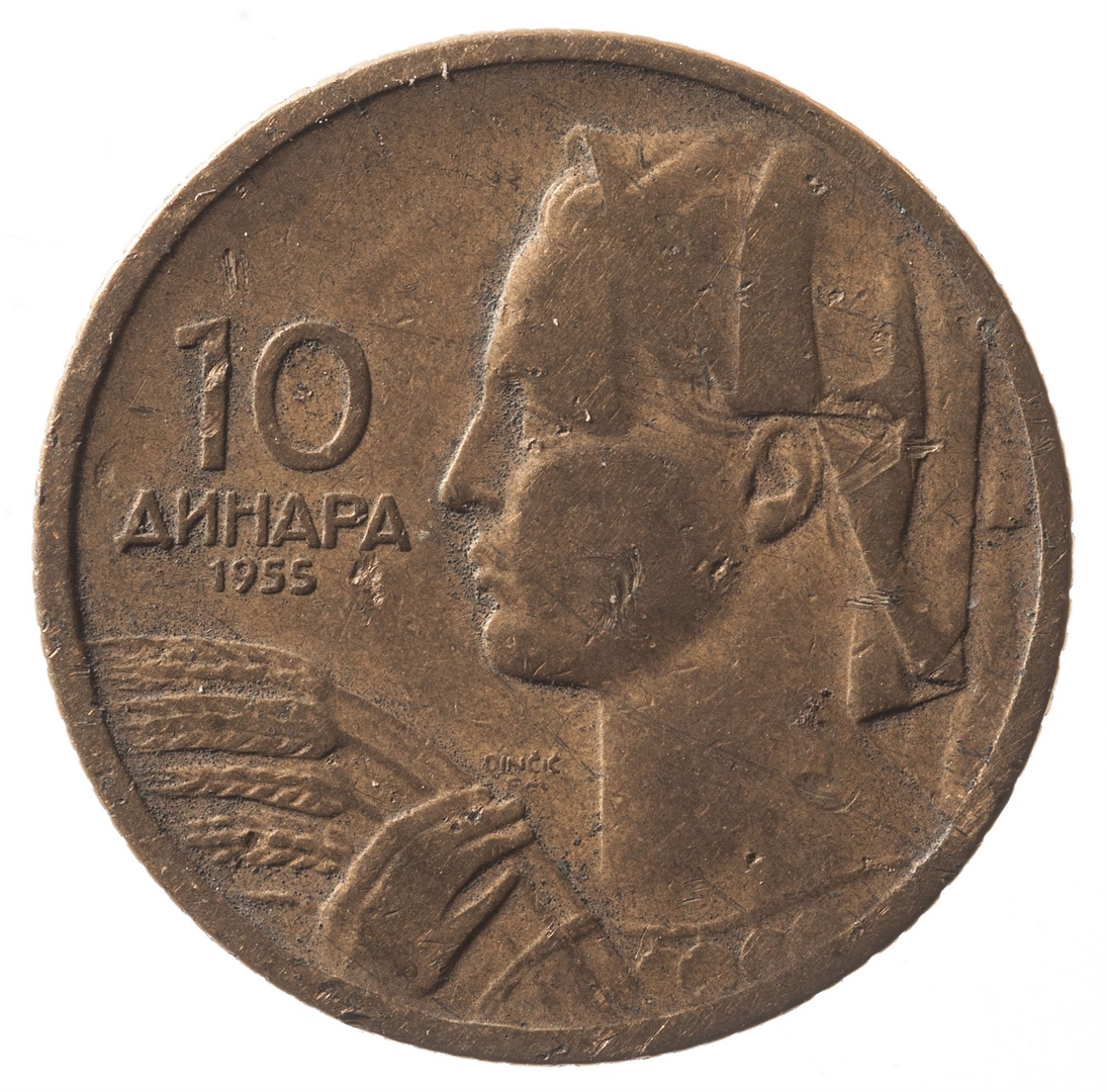 Prikaz seljanke koja drži žito u profilu.Uz rub broj 10 (nominala), a ispod njega tekst DINARA na ćirilici i godina 1955.