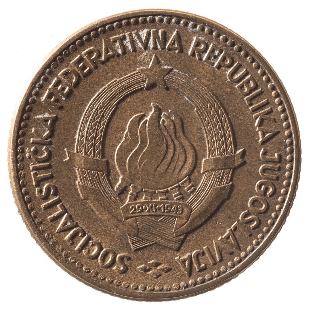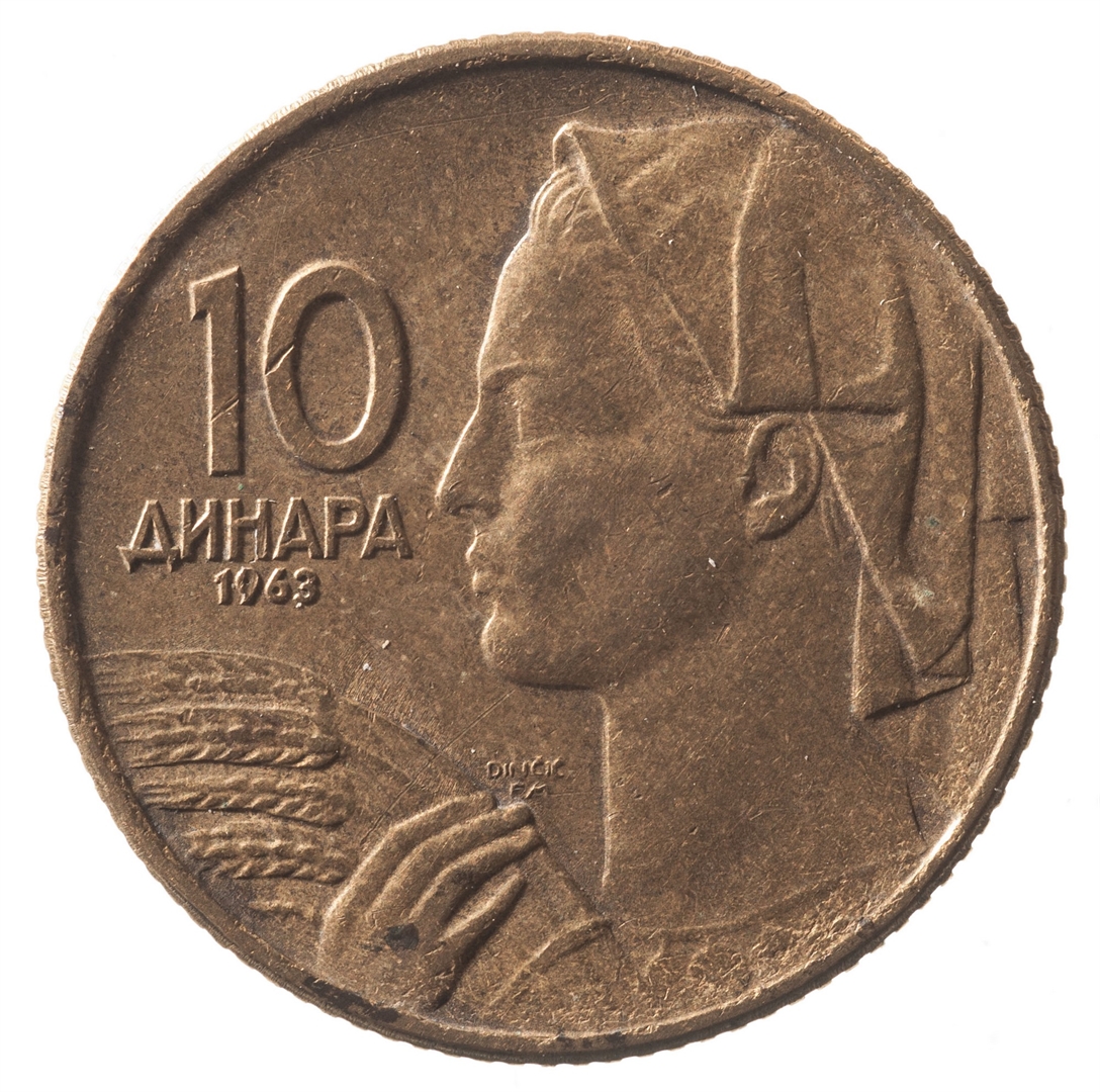 Prikaz seljanke koja drži žito u profilu.Uz rub broj 10 (nominala), a ispod njega tekst DINARA na ćirilici i godina 1955.
