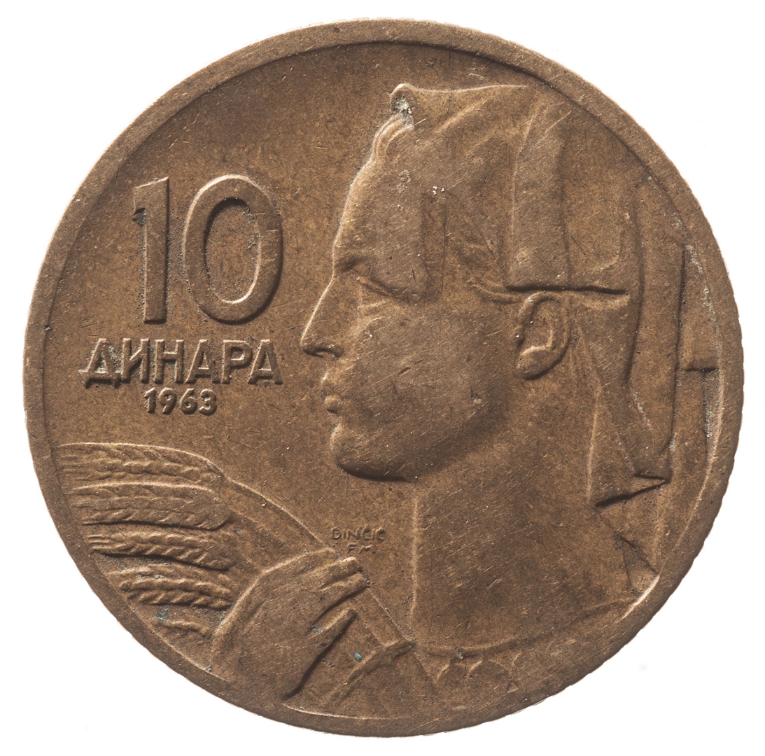Prikaz seljanke koja drži žito u profilu.Uz rub broj 10 (nominala), a ispod njega tekst DINARA na ćirilici i godina 1963.