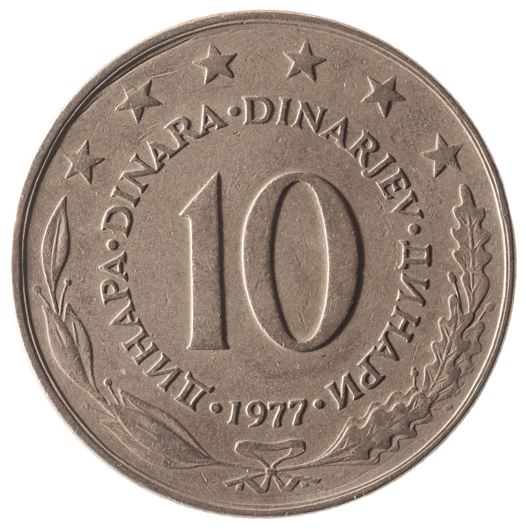 U sredini broj 10 (nominala), oko njega tekst DINAR na četiri jezika, a ispod toga godina 1977. Duž gornjeg ruba polukružno poredano 6 petokrakih zvjezdi.
