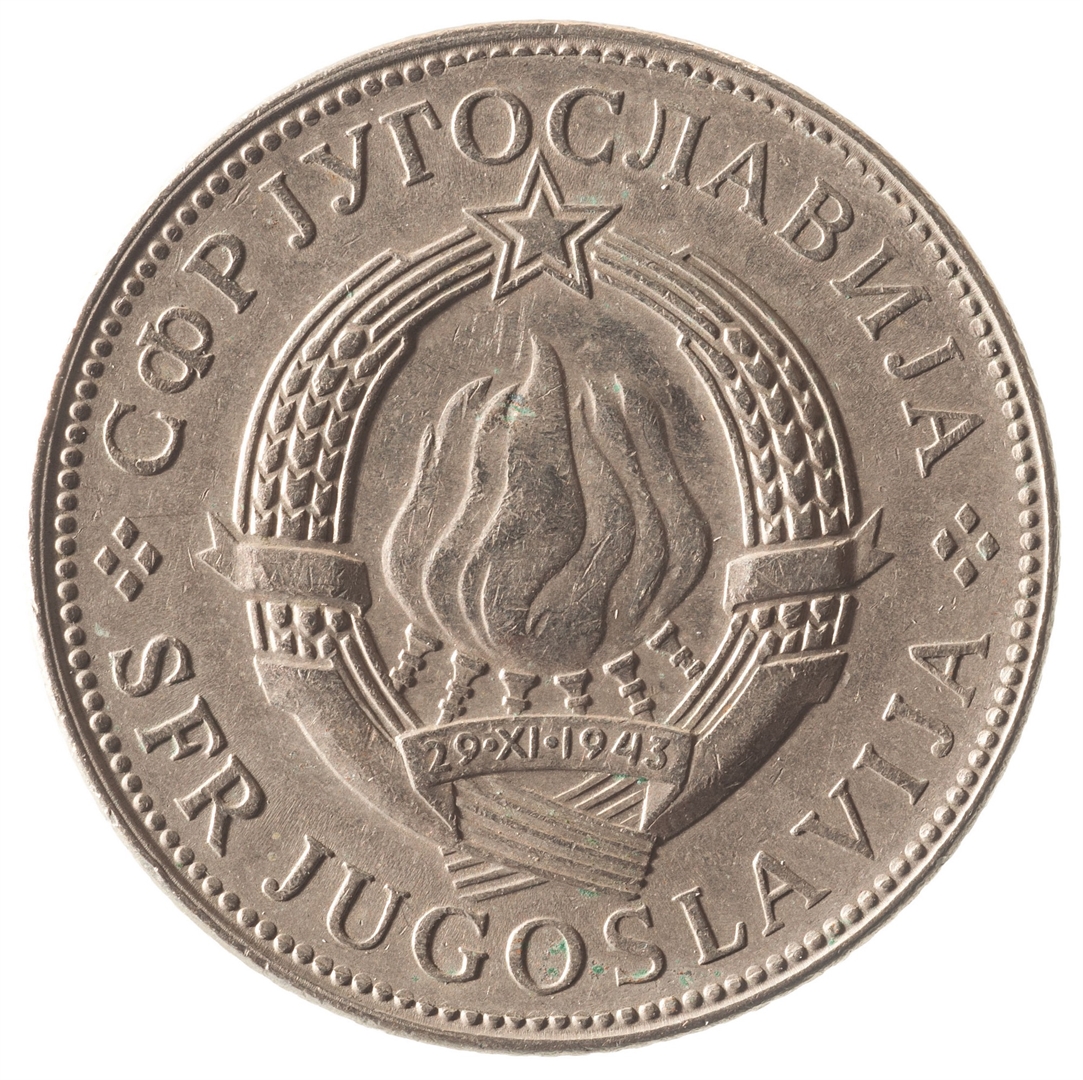 U sredini državni grb. U oko njega uz rub polukružno napisan tekst SFR JUGOSLAVIJA na latinici i ćirilici.