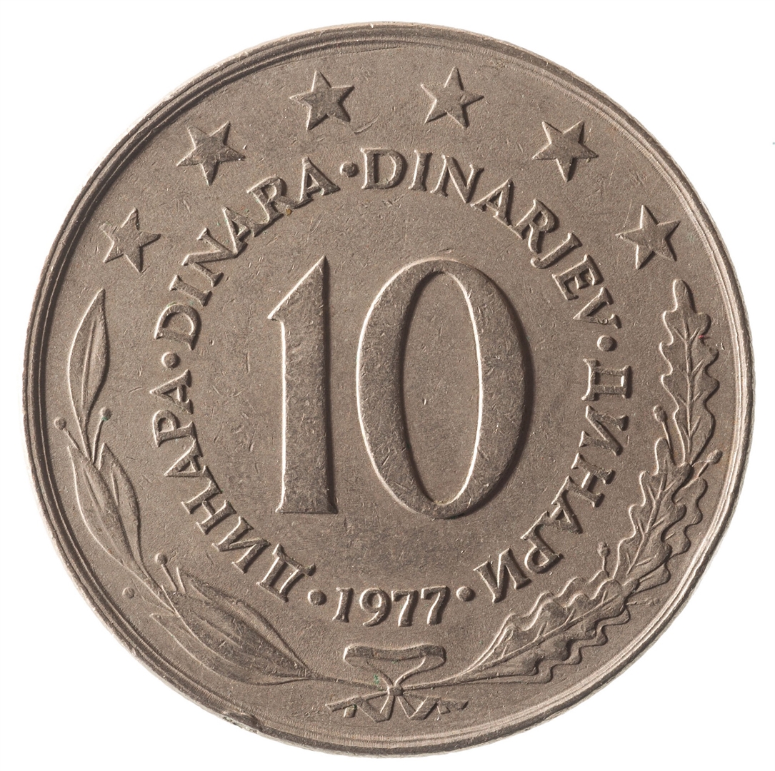 U sredini broj 10 (nominala), oko njega tekst DINAR na četiri jezika, a ispod toga godina 1977. Duž gornjeg ruba polukružno poredano 6 petokrakih zvjezdi.