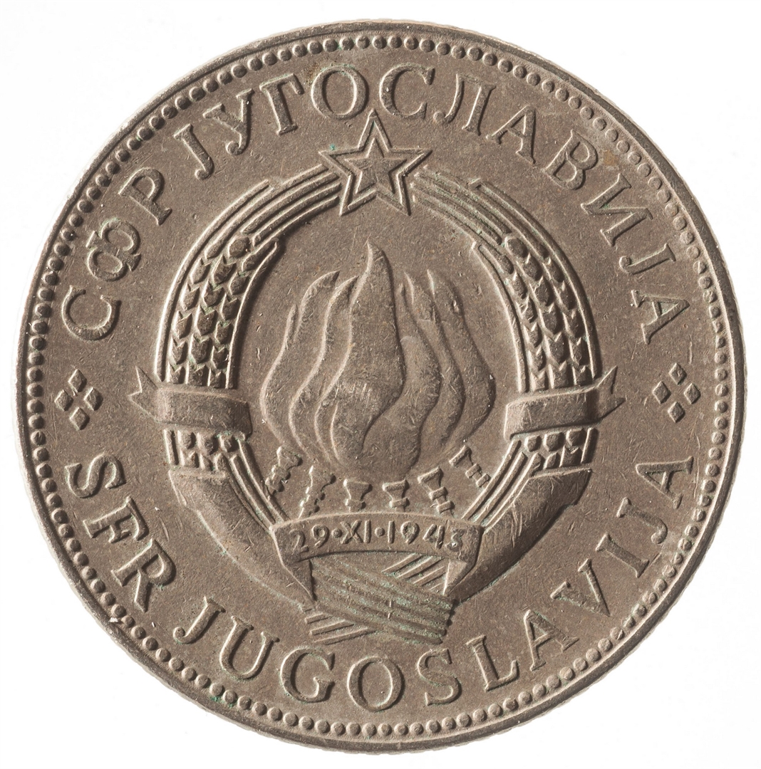 U sredini državni grb. U oko njega uz rub polukružno napisan tekst SFR JUGOSLAVIJA na latinici i ćirilici.