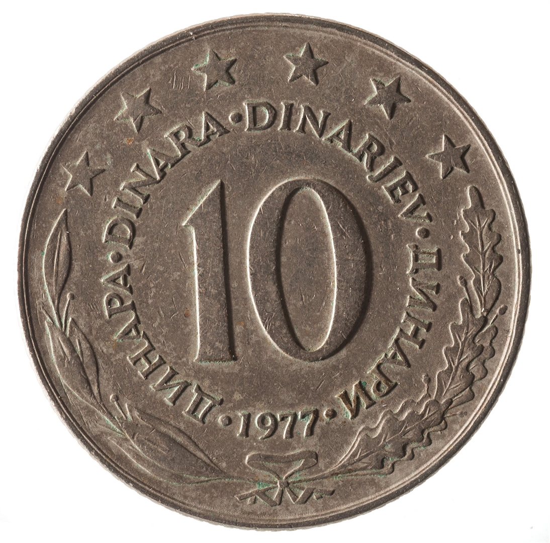 U sredini broj 10 (nominala), oko njega tekst DINAR na četiri jezika, a ispod toga godina 1977. Duž gornjeg ruba polukružno poredano 6 petokrakih zvjezdi.