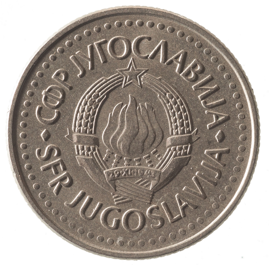 U sredini državni grb. Oko njega uz rub polukružno napisan tekst SFR JUGOSLAVIJA na latinici i ćirilici.