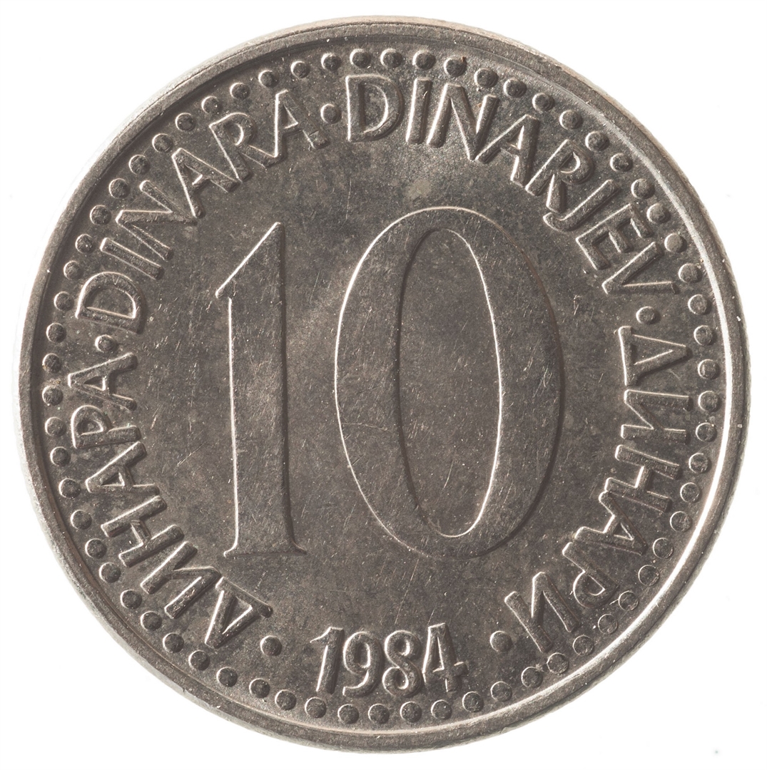 U sredini broj 10 (nominala), oko njega tekst DINAR na četiri jezika, a ispod toga godina 1984.