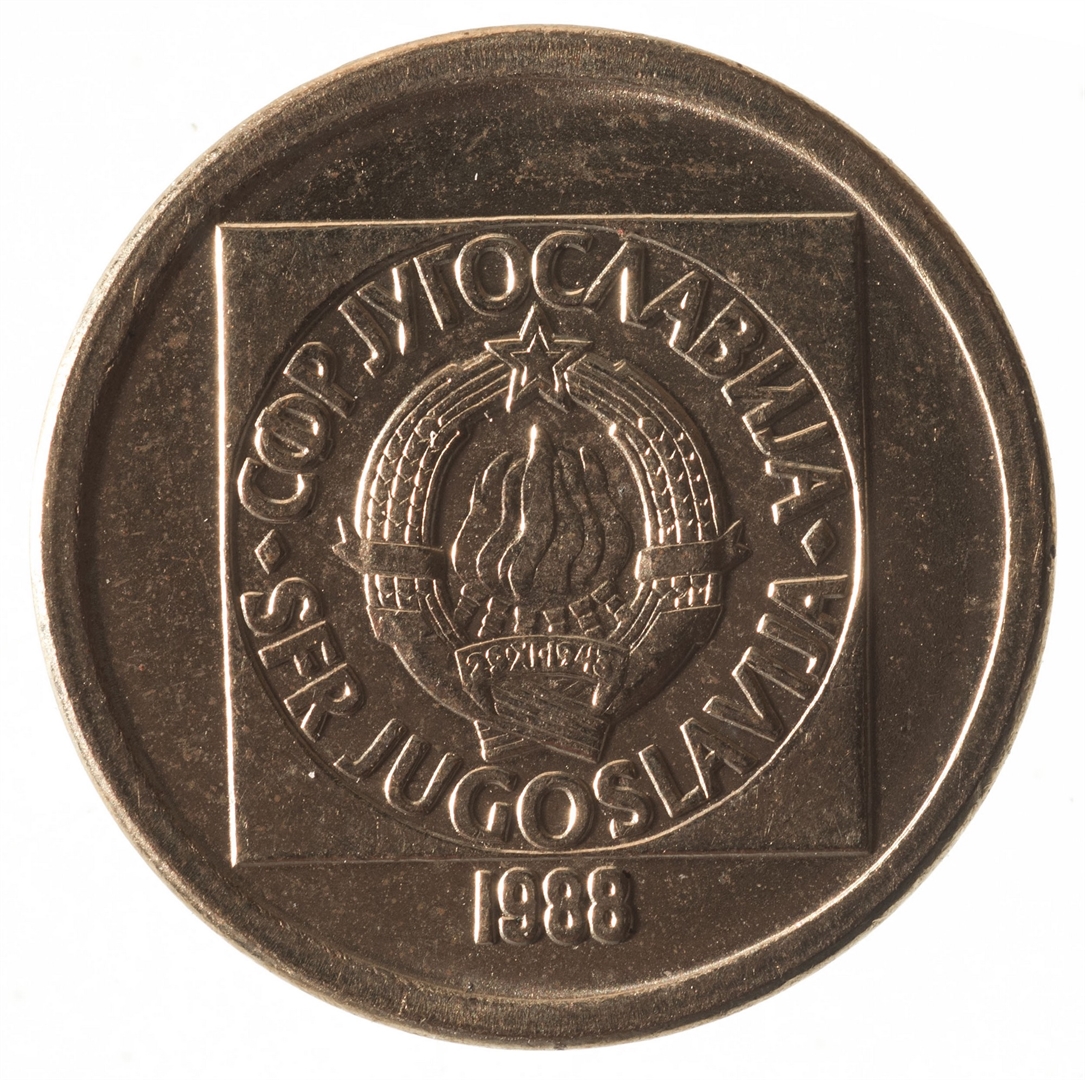U sredini unutar četverokuta državni grb, a oko njega uz rub polukružno napisan tekst SFR JUGOSLAVIJA na latinici i ćirilici. Ispod godina 1989.