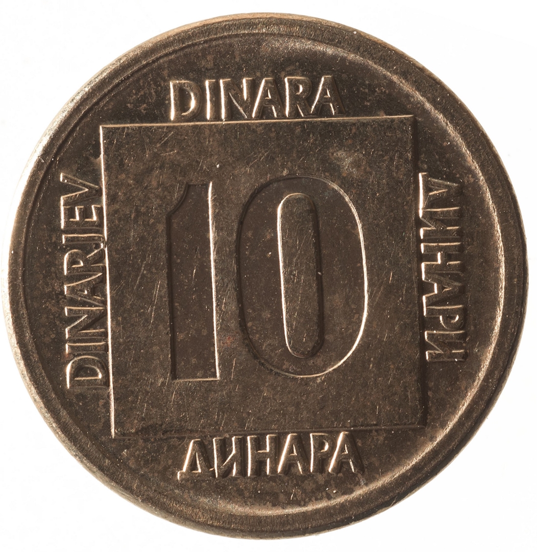 U sredini četverokuta broj 10 (nominala), oko njega tekst DINAR na četiri jezika.