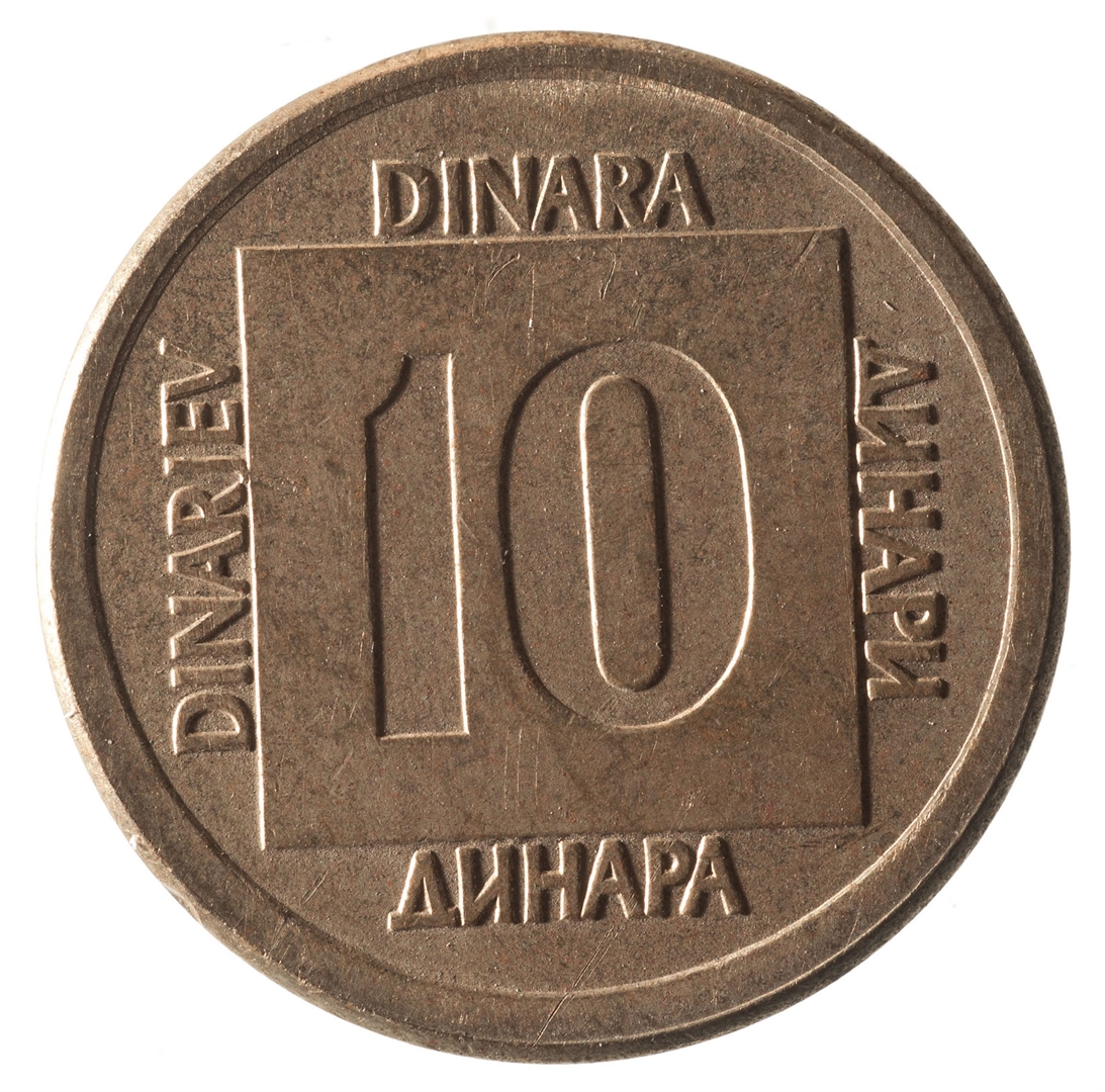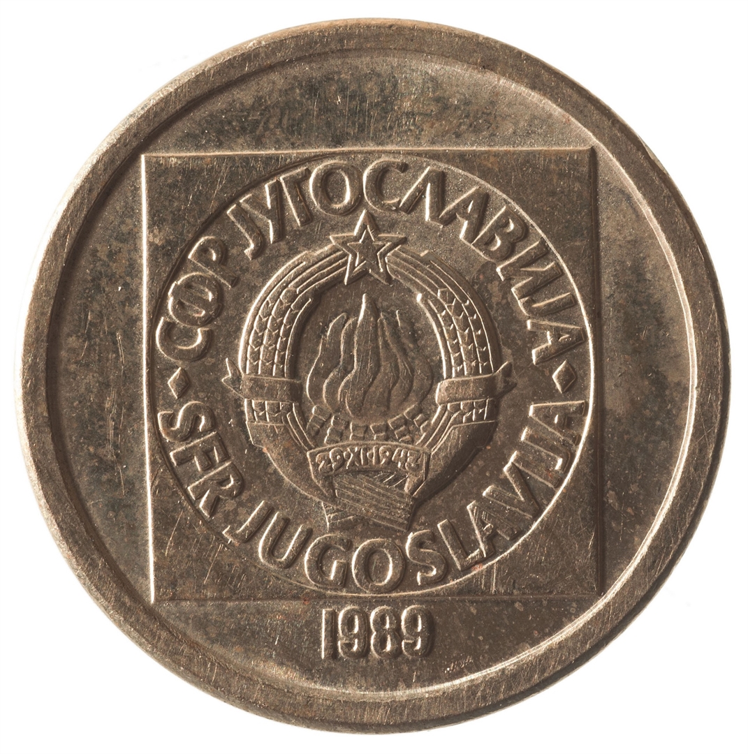 Avers: U sredini unutar četverokuta državni grb, a oko njega uz rub polukružno napisan tekst SFR JUGOSLAVIJA na latinici i ćirilici. Ispod godina 1989. Revers: U sredini četverokuta broj 10 (nominala), oko njega tekst DINAR na četiri jezika.