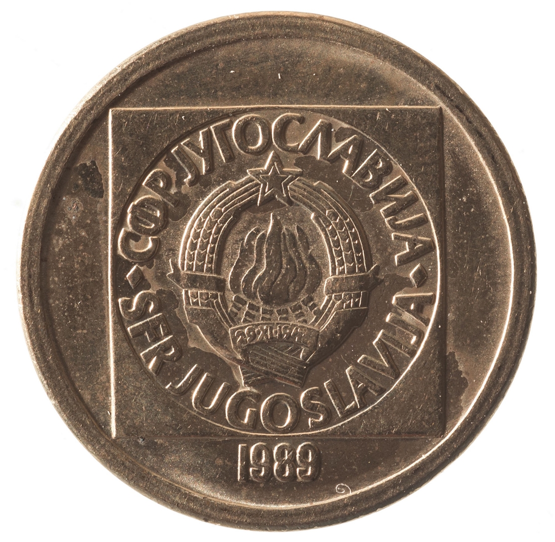 U sredini unutar četverokuta državni grb, a oko njega uz rub polukružno napisan tekst SFR JUGOSLAVIJA na latinici i ćirilici. Ispod godina 1989.