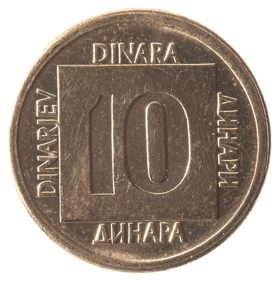 U sredini četverokuta broj 10 (nominala), oko njega tekst DINAR na četiri jezika.